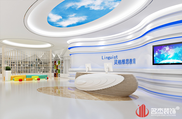 灵格维思教育城学校装修设计说明,此案例设计师通太过析调研客户主营教学课程分为几大板块,有英语室、语数课堂、跆拳道课室、舞蹈课室、演奏厅、一对三教学室,思量学生德智体全方面生长。设计理念以明亮轻快的色彩搭配撒播充满活力的教学气氛,明确标识教学理念,以培育出优异的莘莘学子。